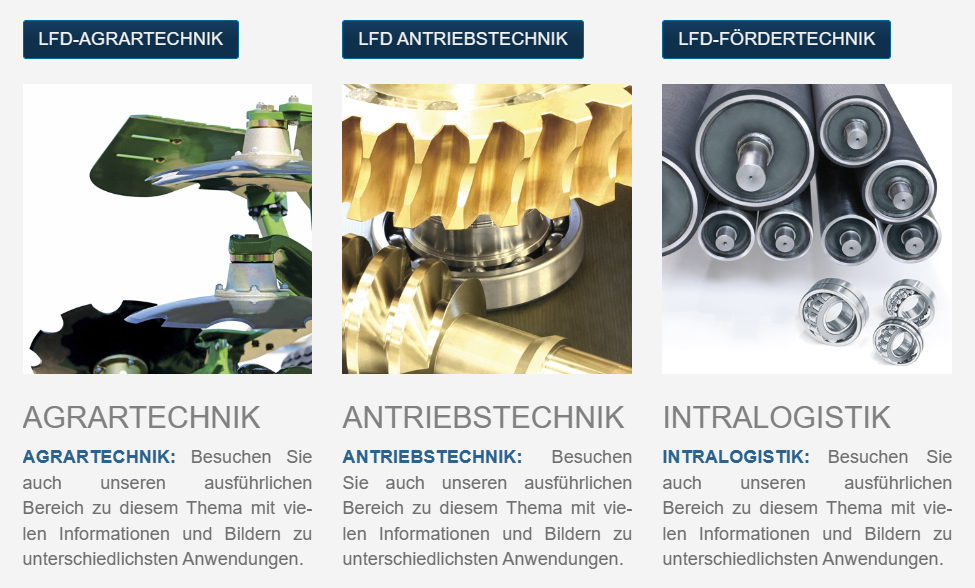 Dazu hat LFD nun auch jeweils eigene Homepages für die Bereiche Logistik, Agrartechnik, Antriebstechnik und auch einen Bereich für weitere Anwendungen und andere interessante Fachartikel.