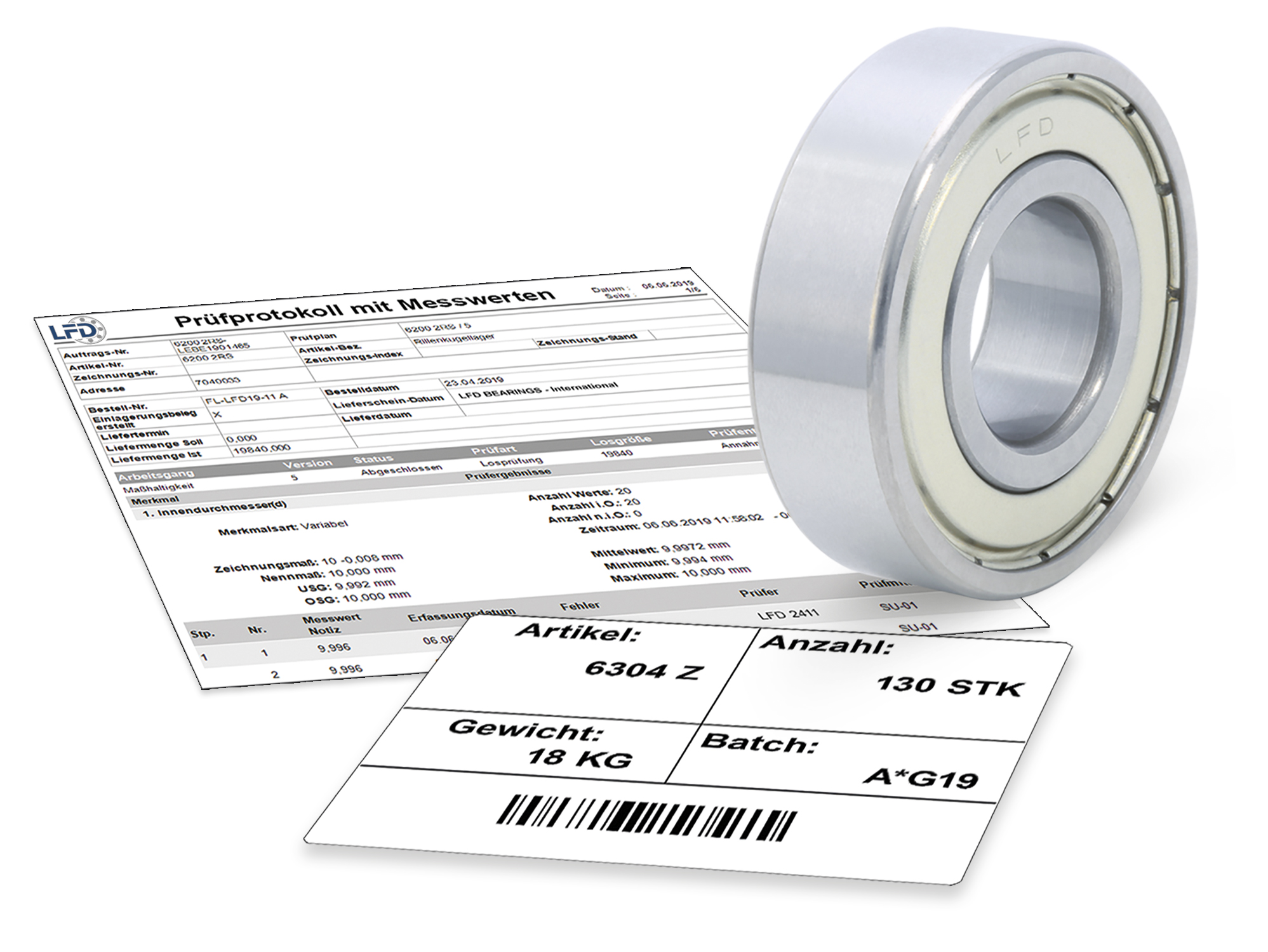 Somit kann LFD anhand der Batchcodes oder mittels Lieferscheinnummer jedes Wälzlager bis an seinen Ursprung zurückverfolgen. So können jederzeit Auskünfte über die Messdaten abgefragt werden.