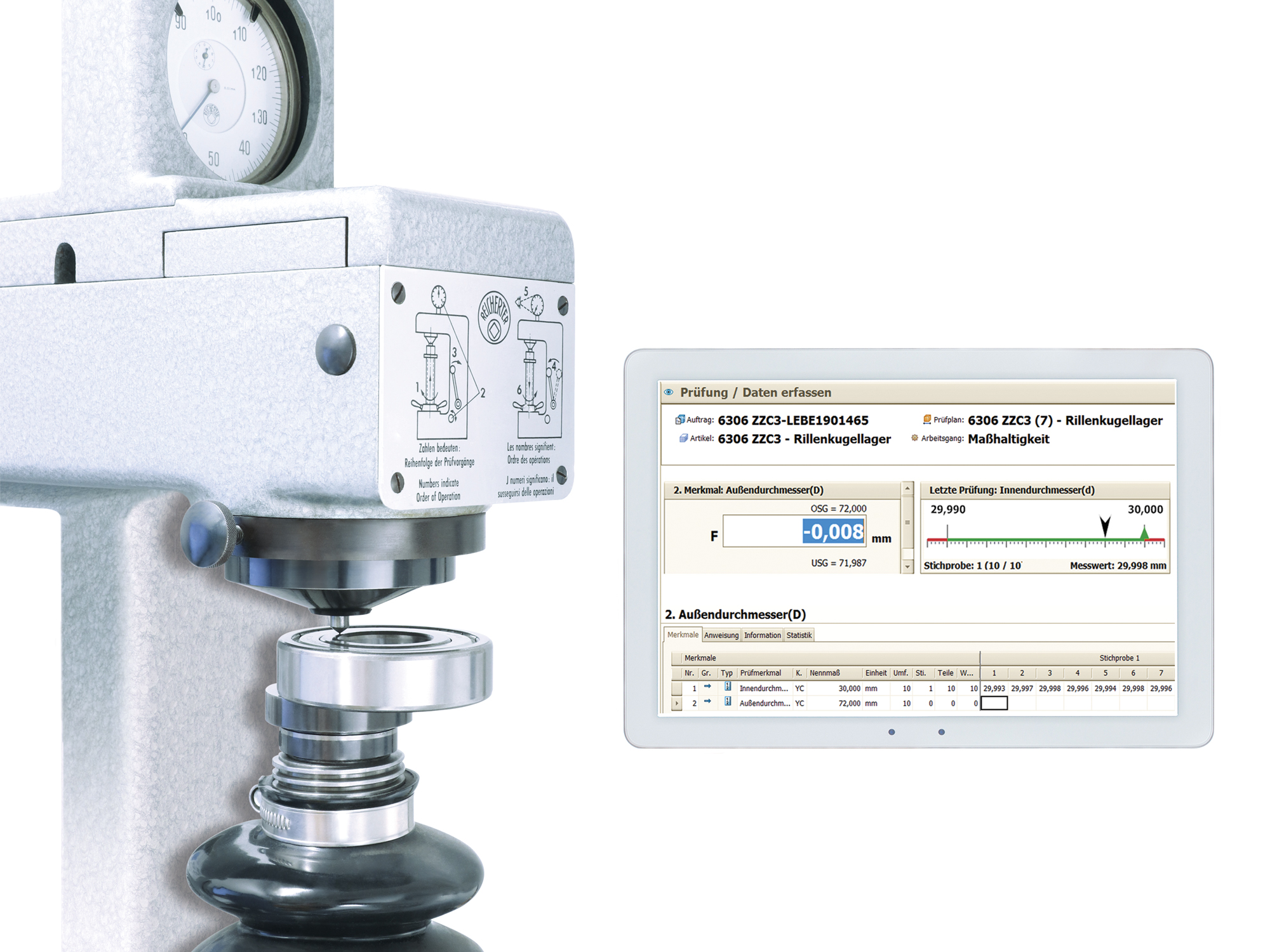Der Prüfplan gibt die durchzuführenden Prüfungen vor. Entsprechend wird auf Dimension, Härte, Lagerluft, Geräusch, Zeichnungsmaße und vieles mehr geprüft. Jedes einzelne Lager wird allen Prüfungen unterzogen.