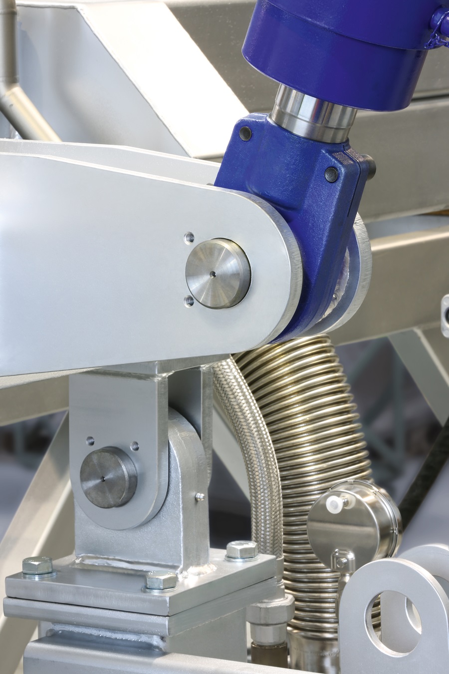 Bei dem großen Brenner sind Gelenklagerköpfe an den Hydraulikzylindern installiert, aber zusätzlich auch fest verbaut. Zum einen muss der Arm sicher geführt werden, wofür zwei Lager im Einsatz sind, die leichte Fluchtungsfehler ausgleichen. Gleichzeitig müssen sie aber auch eigentlich die ganze Last aufnehmen. Zum anderen gibt es Gelenkköpfe an den Hydraulikzylindern, um beispielsweise keine Querkräfte auf die Kolbenstangen oder die Dichtungen wirken zu lassen. Dadurch würde die Konstruktion einerseits schwergängiger und auf Dauer würde es zu einem erhöhten Verschleiß am Zylinder und an den Lagerungen kommen.